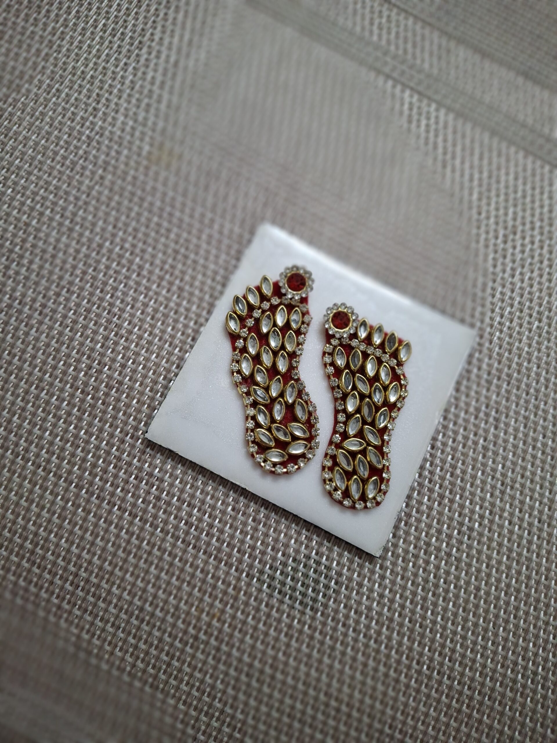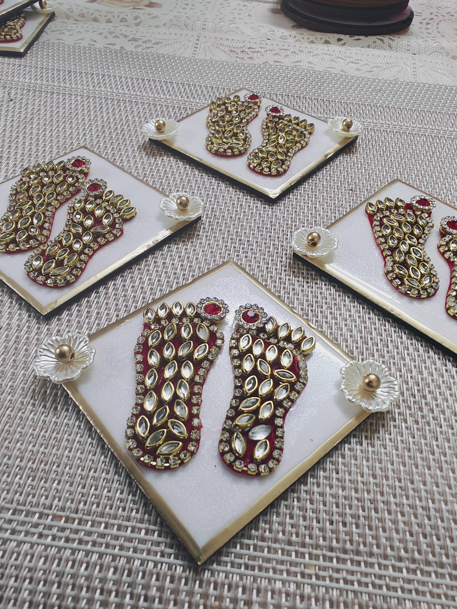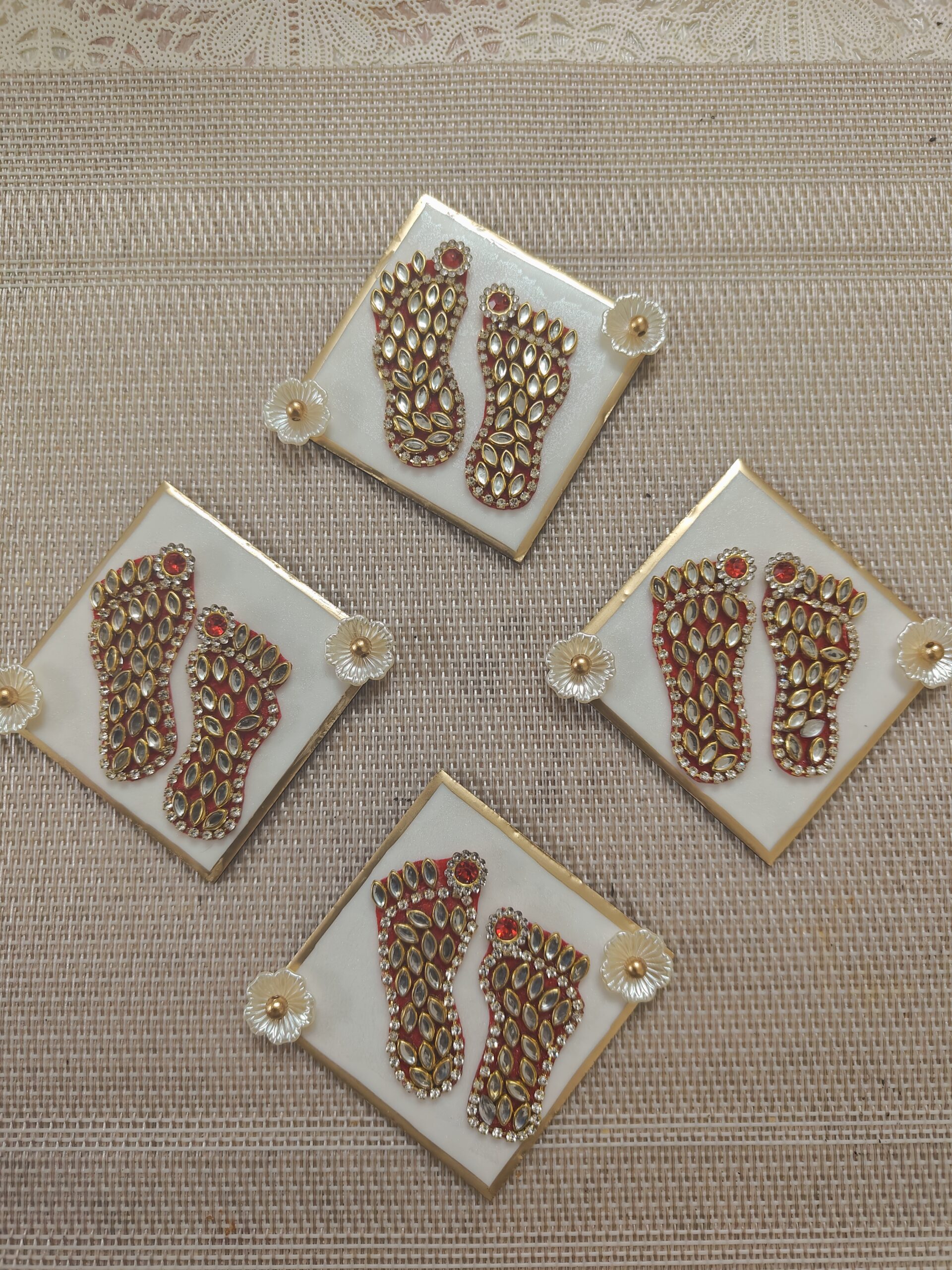 A beautiful set of four handcrafted resin tiles featuring Charan — sacred footprints symbolizing divine presence and blessings. Each tile displays intricately designed golden footprints adorned with sparkling stones on a pearlescent white background with gold borders. Delicate floral embellishments at the corners add a traditional touch, making these tiles perfect for spiritual décor or as meaningful gifts.