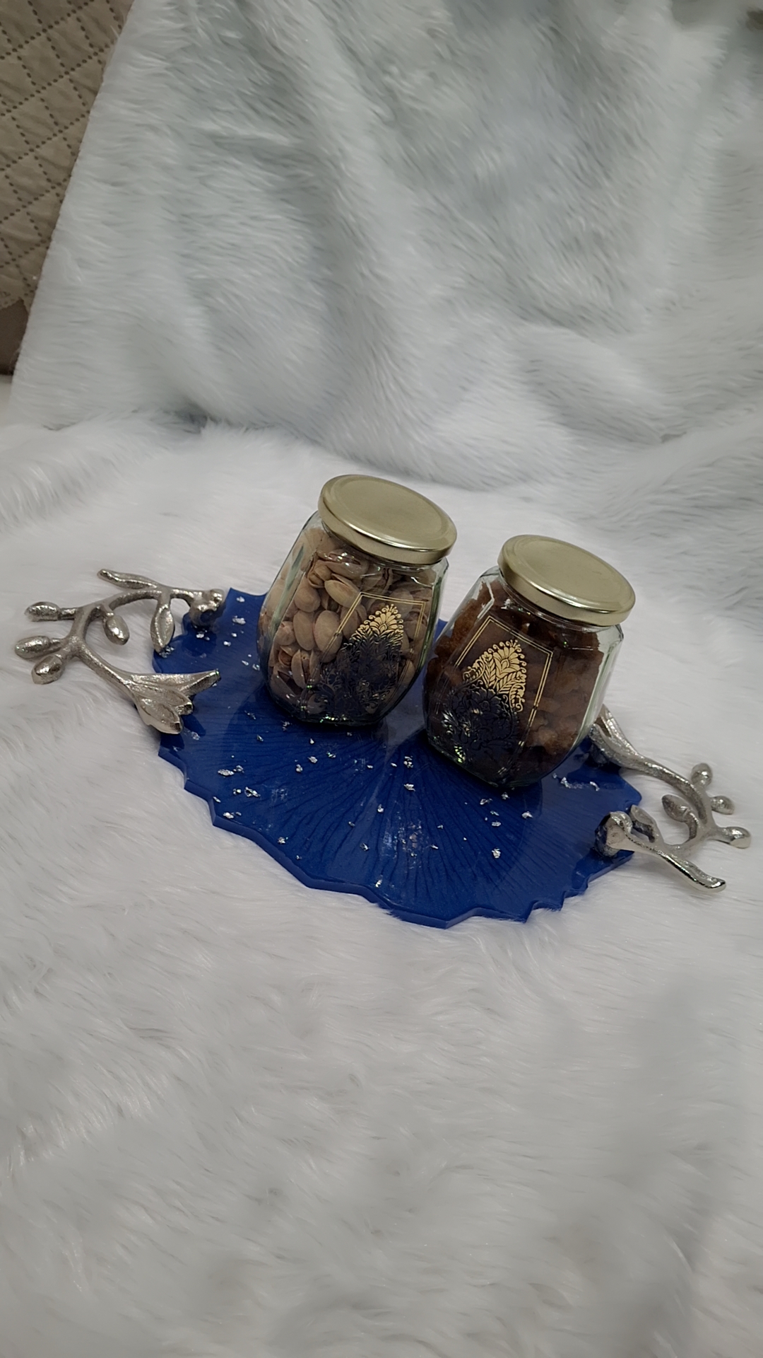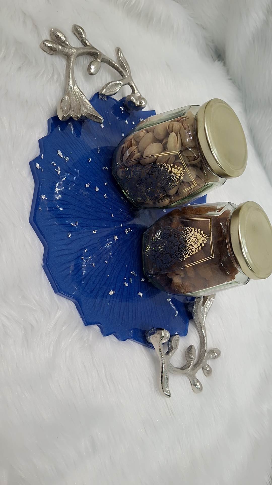 This exquisite resin serving tray features a deep blue base with a delicate fan-like texture, adorned with scattered silver leaf flakes for a touch of shimmer. The tray is accented with sculptural silver branch handles on either side, adding both elegance and functionality. Perfect for serving snacks, displaying decorative items, or as a statement piece on your coffee table.