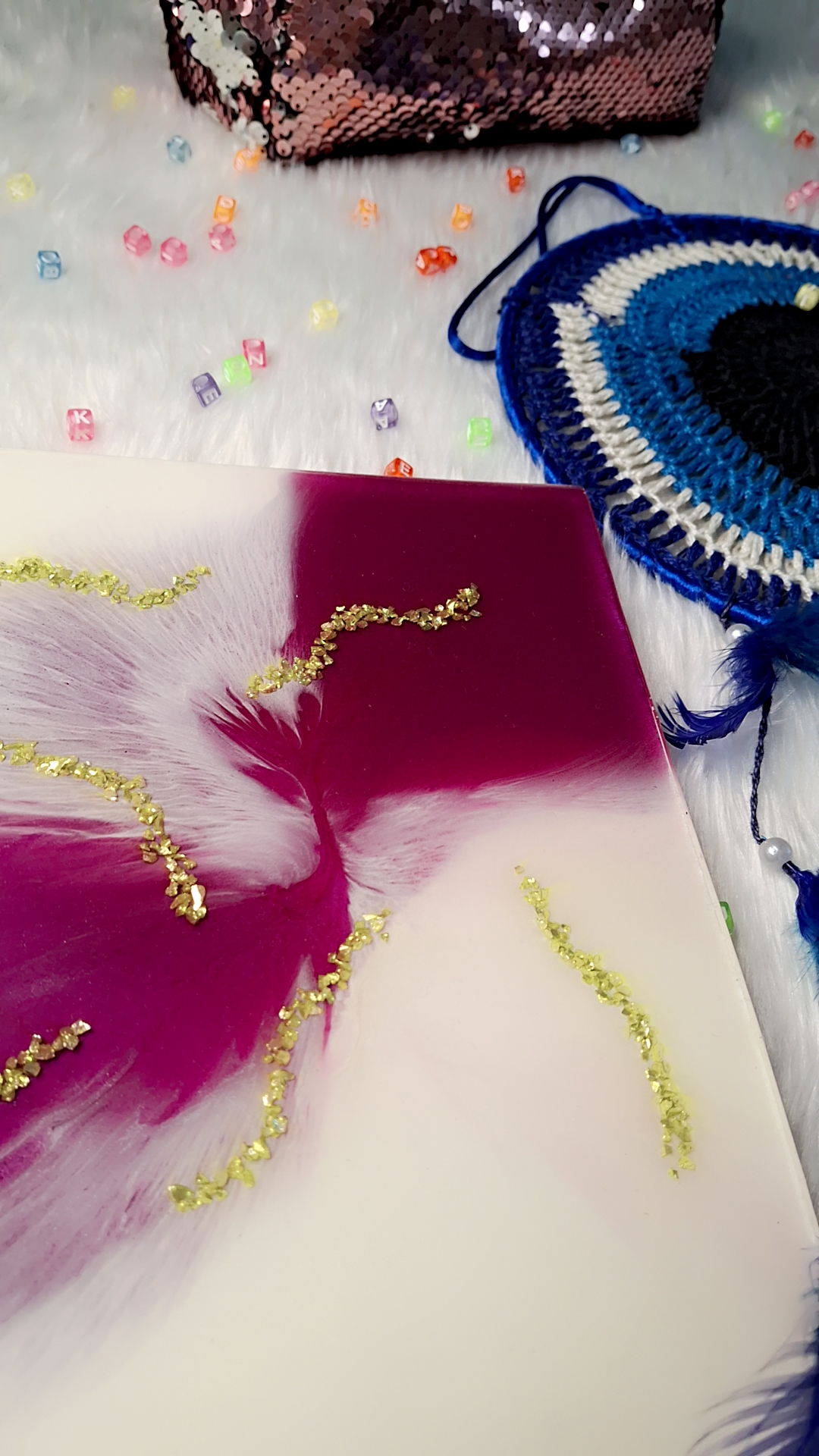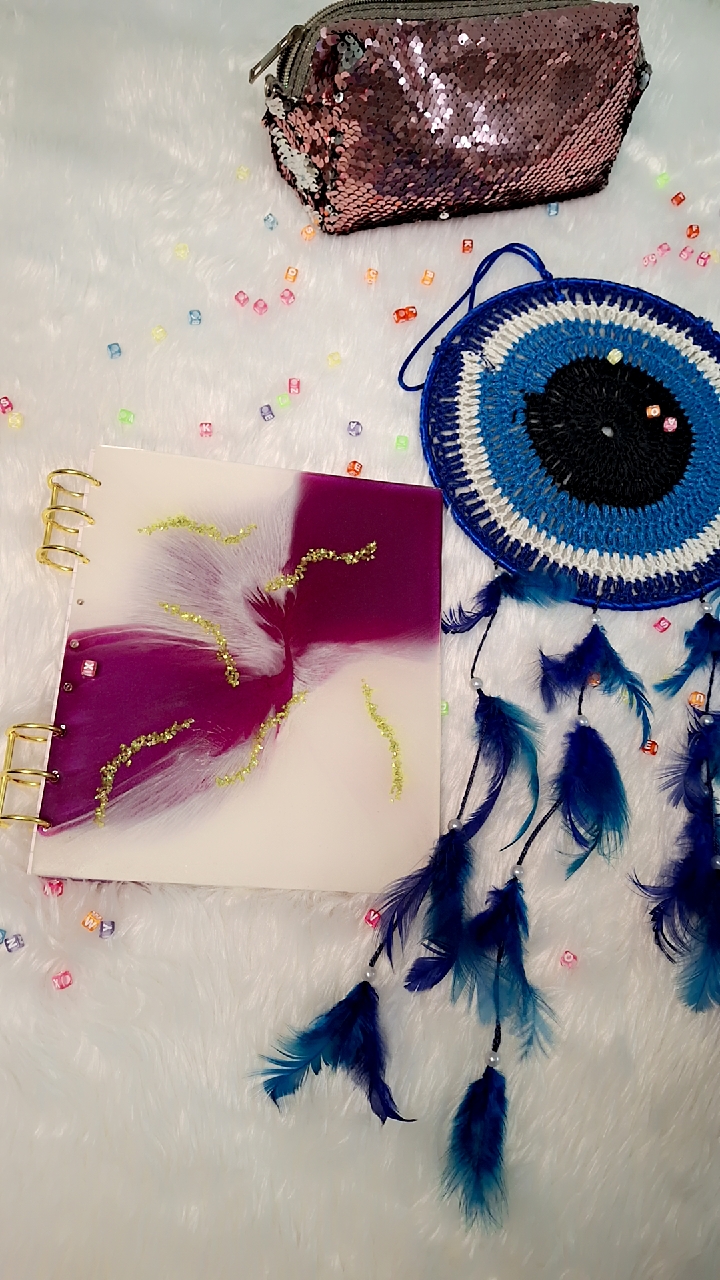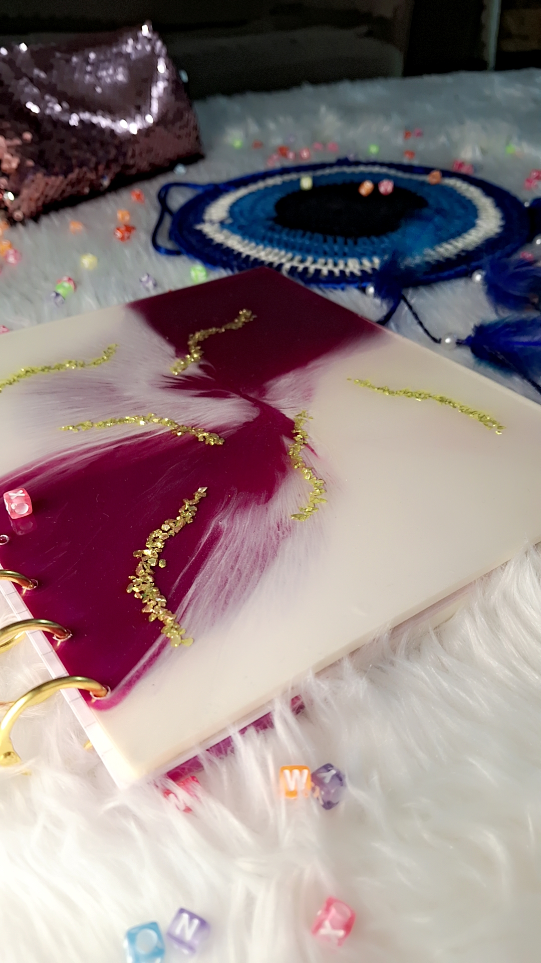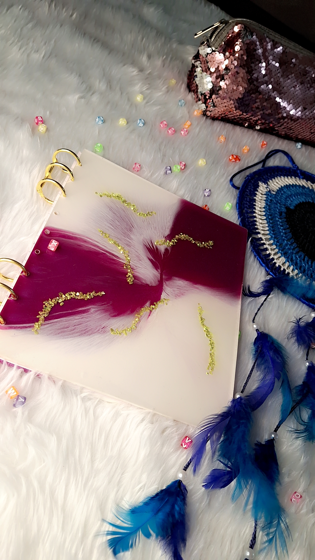 This handcrafted resin diary is a stunning fusion of art and functionality. The cover features a bold marbled blend of plum and ivory white resin, enhanced by a dynamic feathered swirl effect that adds depth and flow. Delicate trails of gold foil flakes accent the surface, giving it a luxurious and luminous finish. Held together with elegant golden binder rings, this diary is a perfect blend of modern aesthetics and artisanal charm.