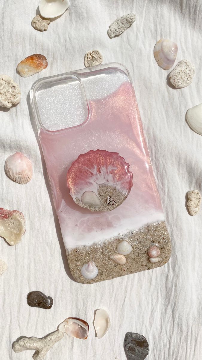 🐚 A romantic fusion of blush pink waves, real beach sand, and hand-picked seashells make this phone case feel like a treasure from the shore. Featuring a large, textured shell as a focal piece, this case is both functional and beautiful.