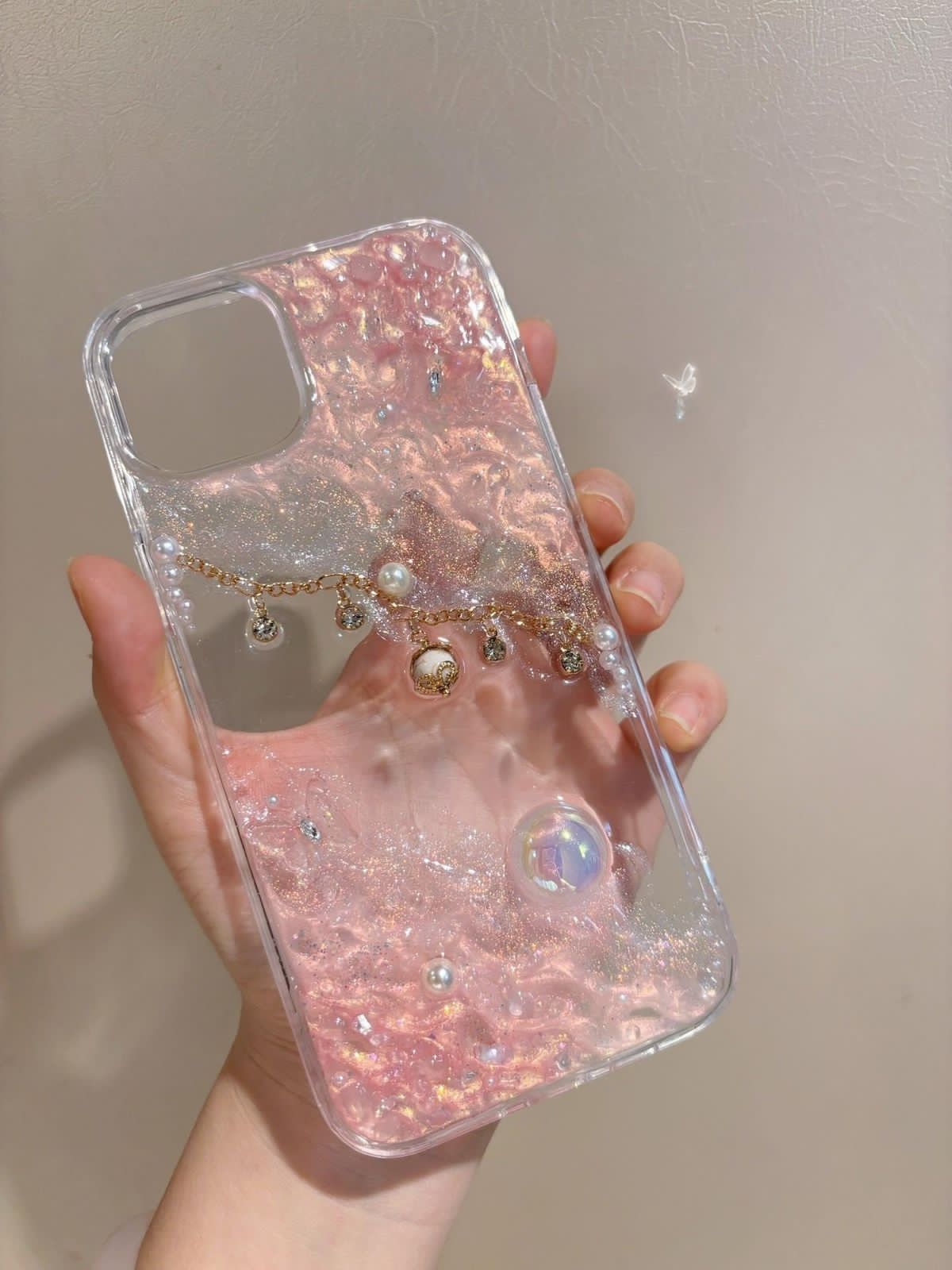 ✨ A sparkling blend of iridescent pink resin, glitter swirls, and a dangling charm chain with pearls and golden seashells. This case is a glamorous statement of underwater fantasy and luxe design. The subtle textures and shine make it a showstopper.